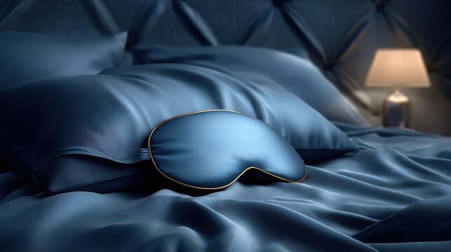 Twilight Blue Satin Sleep Mask on Matching Bedding, Nighttime Luxury Sleep Mockup