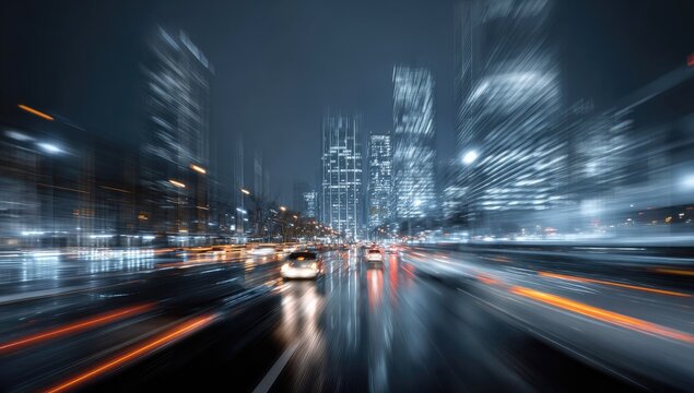 Dynamic, motion-blurred nighttime cityscape with illuminated skyscrapers and streaks of car light