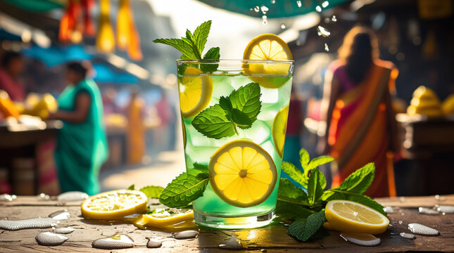 Nimbu Pani – A refreshing glass of Indian lemonade (nimbu pani) with ice cubes, mint leaves, and sliced lemons, set against a sunny outdoor market scene.