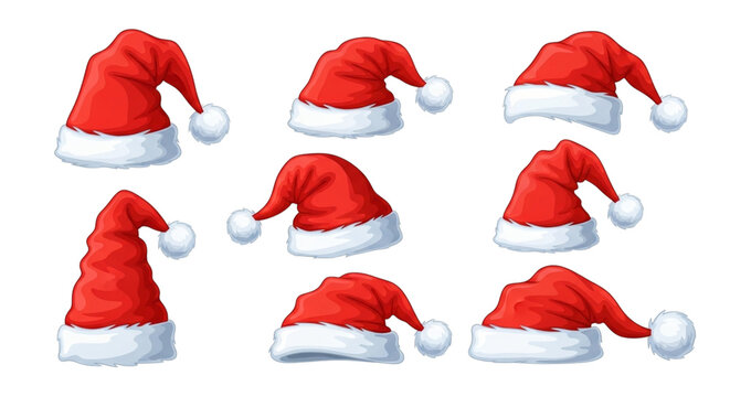Group of nine red santa hats with white fur trim, each with a pompom, isolated on transparent background