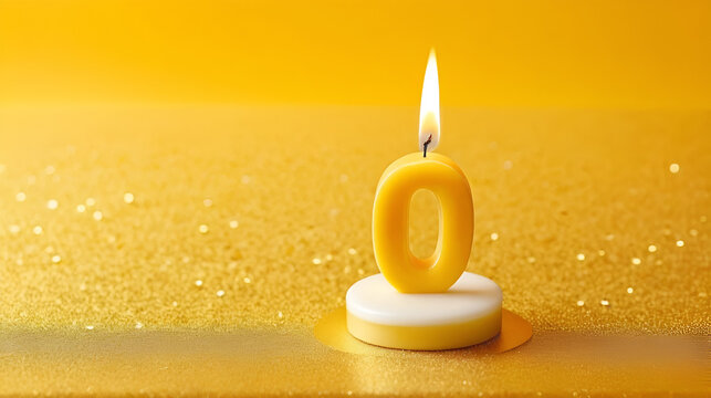 Golden number nine candle on shiny yellow confetti background. Festive backdrop for ninth birthday, anniversary or celebration. Bright greeting card with space for text.