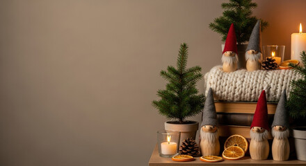 Cozy hygge shelf vignette with nisse figurines, small evergreen trees, and candles creating warm ambiance. Shelf decor includes knitted textiles, pine cones
