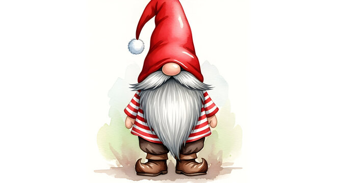 Cute Scandinavian Gnome Illustration (Tomte/Nisse) — Whimsical Red-Hatted Christmas Gnome with Striped Outfit and Long White Beard for Holiday Stickers, Cards, and Home Decor