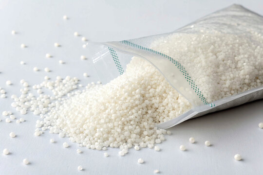 Ammonium nitrate NH4NO3 in a bag on a solid white background