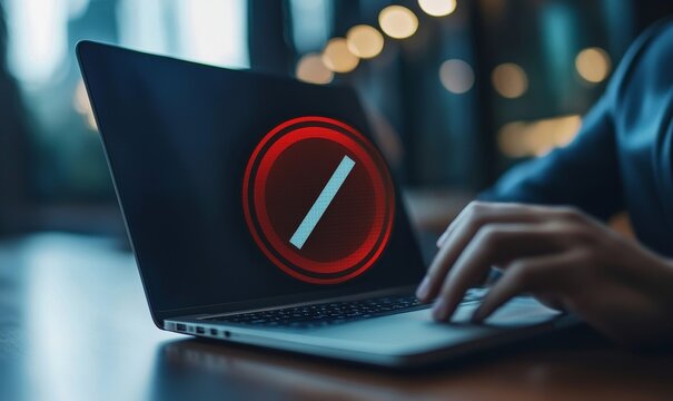 An image symbolizing the restriction or prohibition of artificial intelligence (AI) technology, represented by a red no entry sign overlaying the AI logo on a laptop used by a businessperson in a