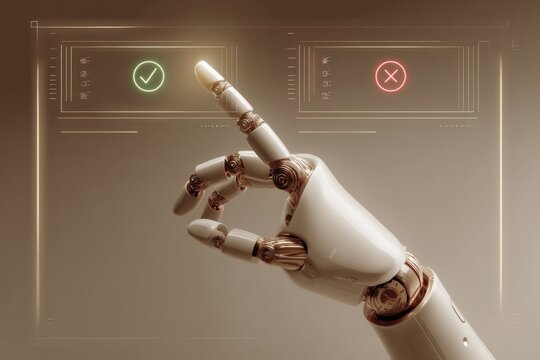 Robotic Hand Interacting with Virtual Interface Displaying Approval and Rejection Symbols, signifying decision and AI influence