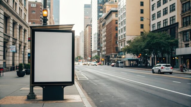 Commercial high-resolution photo of city street hoarding with empty commercial signboard, front view, direct camera front view, no person in street.