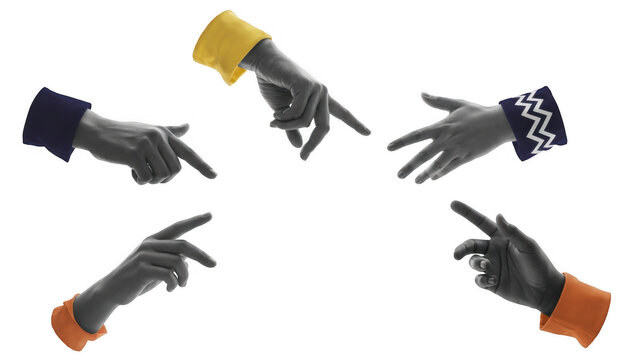 Five hands pointing in different directions with various cuffs fingers gestures isolated on a transparent background