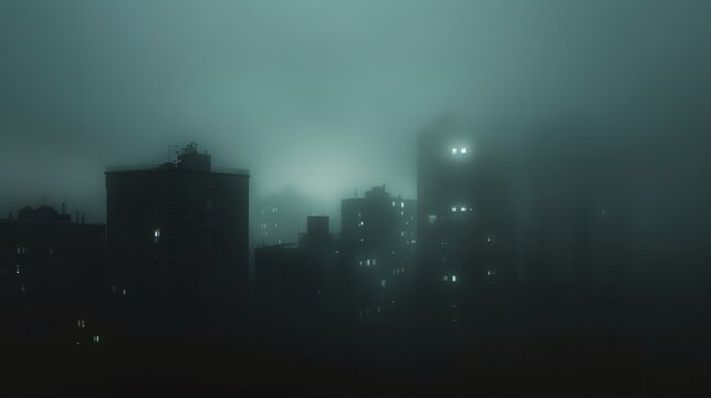 A dark and foggy cityscape. The only light comes from the windows of the buildings. The street is empty and there is no sign of life.