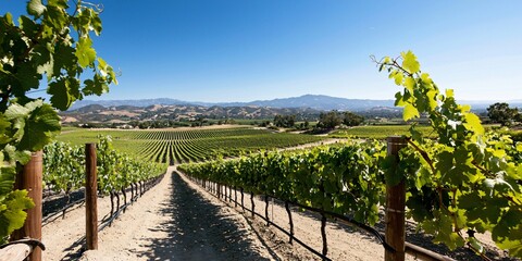 grape leaves rustling gently in the wind, side-lit by a late afternoon sun, vineyard stretching in perfect rows across the terrain, no manmade structures in sight, clear sky and distant ridge