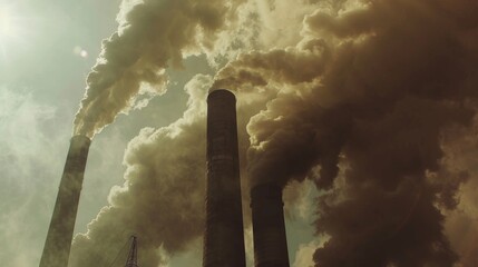 Tall industrial smoke stacks rising high into the cloudy sky, with no other structures in sight
