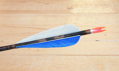 A traditional wooden archery arrow with feather fletching.