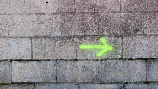 Flecha pintada con spray amarillo fluor en pared de bloques de hormigón