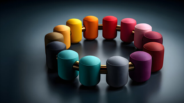 Abstract glowing shells with wooden connectors in modern gallery