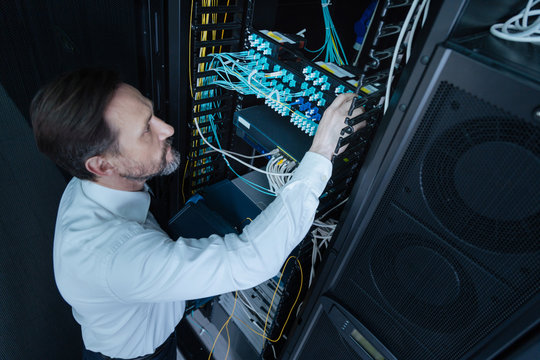 Serious professional technician examining Internet connection