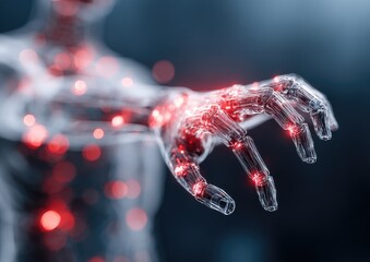 Translucent robotic hand reaching forward, glowing red nodes highlight joints and internal structure against a dark background