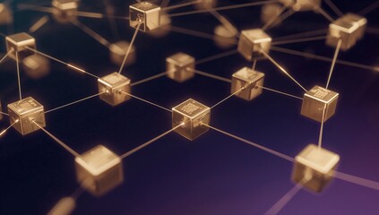 Displaying small metallic gold cubes forming 3D network with lit wires in CGI scene, glowing nodes