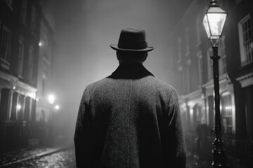 Detective walking through foggy alley in trench coat and fedora