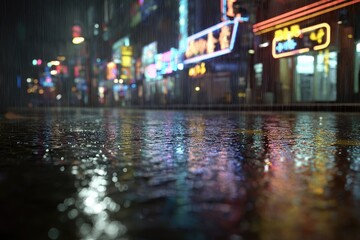 Rainy night street, neon reflections, city backdrop, film noir