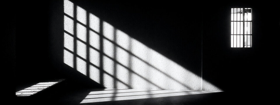 Beams of sunlight through old wooden blinds. Light coming through windows of an old abandoned house. Abstract background, black and white image.