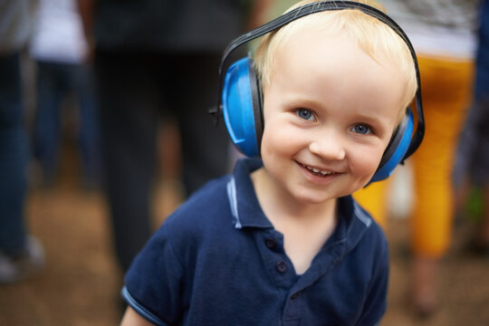 Caucasian Construction Worker in His 20s Wearing Noise Cancellation Safety Headphones While Working Within Construction Site.
