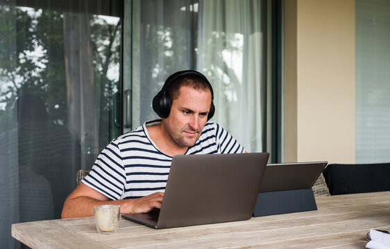 A man with headphones reading a book at home