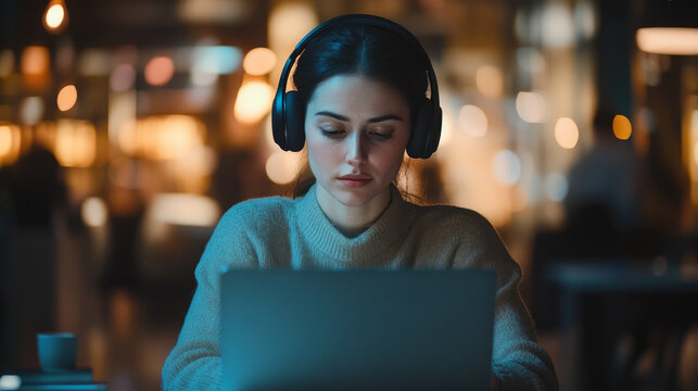 A professional using noise-canceling tech headphones in a bustling office, visibly focused on a laptop, while the noisy background is blurred