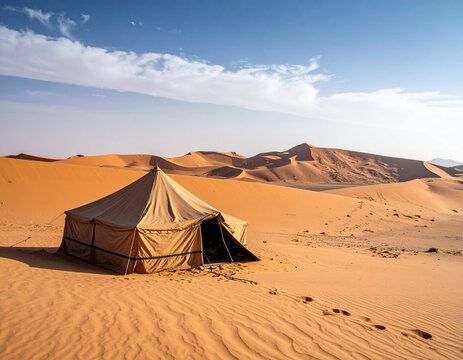 A traditional nomadic tent is seen in a vast, empty expanse of desert sand.