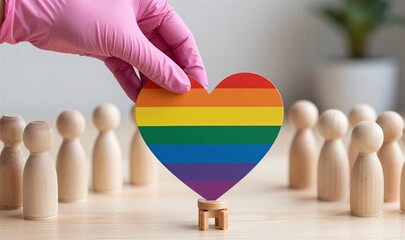 A gloved hand holds up a heart-shaped rainbow flag, symbolizing LGBTQ rights and inclusivity among wooden figurines representing diverse individuals on the table.
