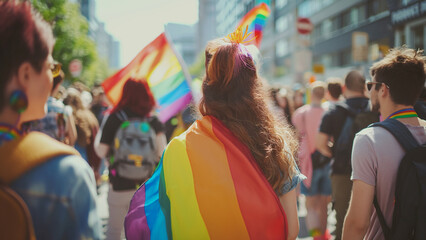 Rear view of people in the pride parade. Group of people on the city street with gay rainbow flag.