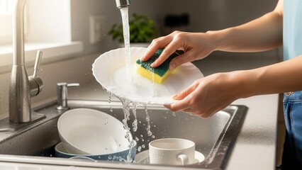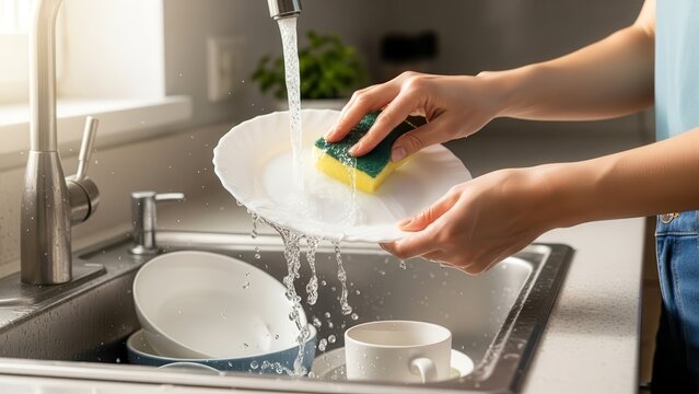 Woman washing dishes in kitchen sink.