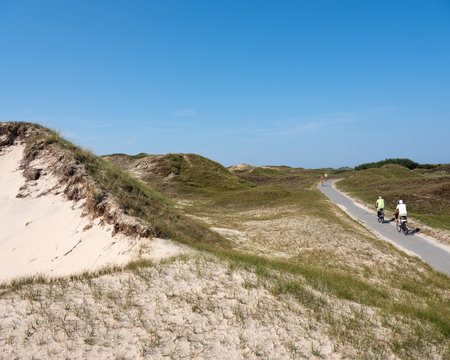 people enjoy nature by riding bicycle on the german island of norderney on sunny summer day in august