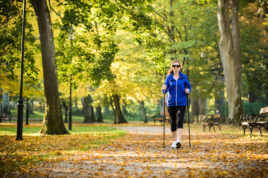 A group of young people are doing Nordic walking in an autumn park. Photo from the side. Healthy lifestyle concept. Advertising banner.