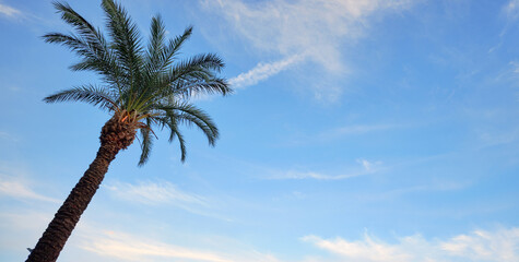 Palm and sky. Phoenix is a genus of fourteen species of palm trees native to the Canary Islands, north and central Africa, southeastern Europe, China and Malaysia.
