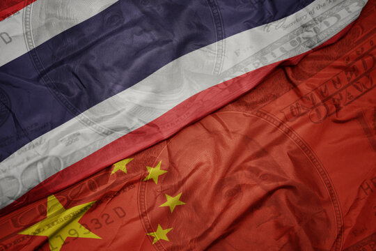 waving colorful flag of thailand and national flag of china on the dollar money background. finance concept.