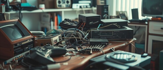 A cluttered desk filled with vintage electronics offers a nostalgic glimpse into the past, revealing a passion for retro technology.