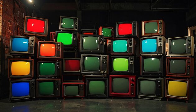 Vintage TVs stacked in a dark room