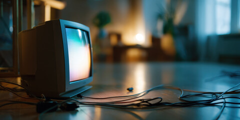 CRT monitor glow vintage television retro technology old TV set blurred background cozy room lighting nostalgic electronics