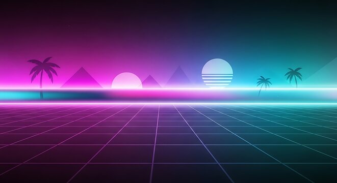 Floating neon triangles hovering over glowing retro grid with synthwave light beams