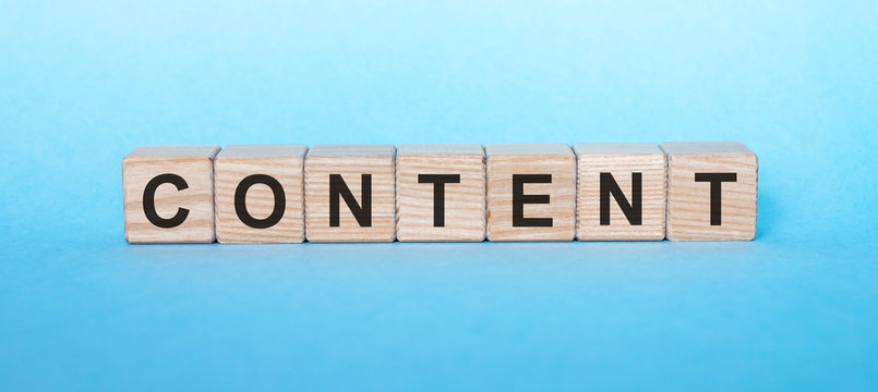 Content word text on wooden cube blocks on blue background. Digital marketing concept.