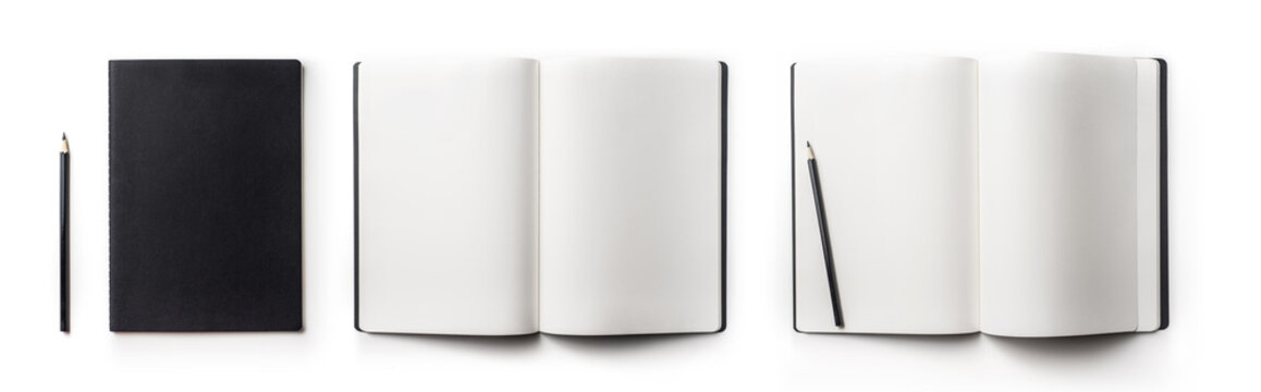 Minimalistic isolated shot of a wooden pencil and a spiral notebook on a white background, ideal for office supplies or educational products.