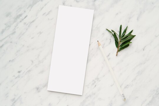 Skinny notepad mockup on marble background, notebook, memo pad, list mock up for design presentation, white pencil, top view.