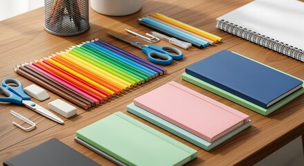 A desk with colored pencils notebooks scissors and other stationery items arranged neatly on its surface