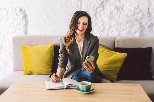 Writing dairy on notebook in coffee shop, concept as memory of life. woman with mobile phone and pen on Wooden table with cup of coffee in coffee shop. Smiling Businesswoman Making Notes Notepad