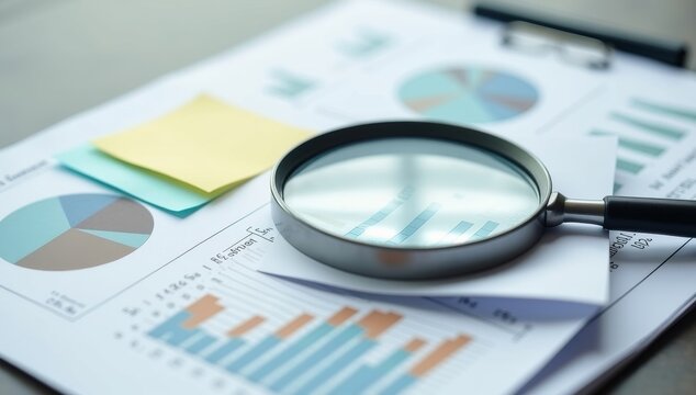 close-up shot of a magnifying glass resting on a stack of documents. The documents are filled with data and graphs, and some have sticky notes attached. The background is a soft, neutral color