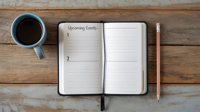 Open planner with 'Upcoming Events' section and numbered spaces, next to a coffee cup and pencil on wood.