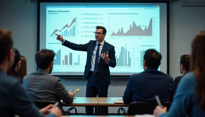 An experienced professor delivers an engaging economy lesson in a well-lit classroom with students focused on data charts and graphs.