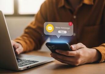 Hands typing on laptop and tapping tablet while digital notification badges float
