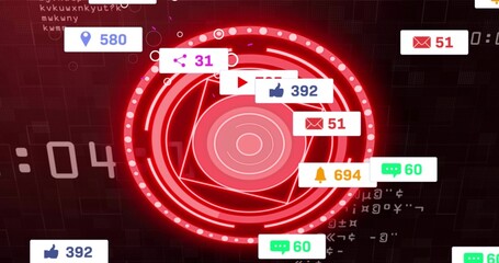 Rotating neon binary hud with glowing 0s and 1s, notification badges on blue radar rings