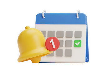 3d icon of calendar with a notification bell and a checkmark, signifying important dates and completed tasks isolated on transparent background